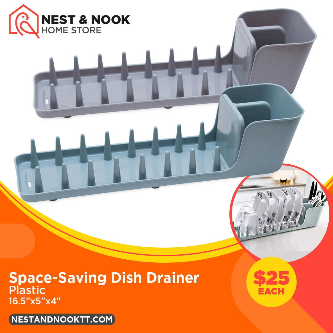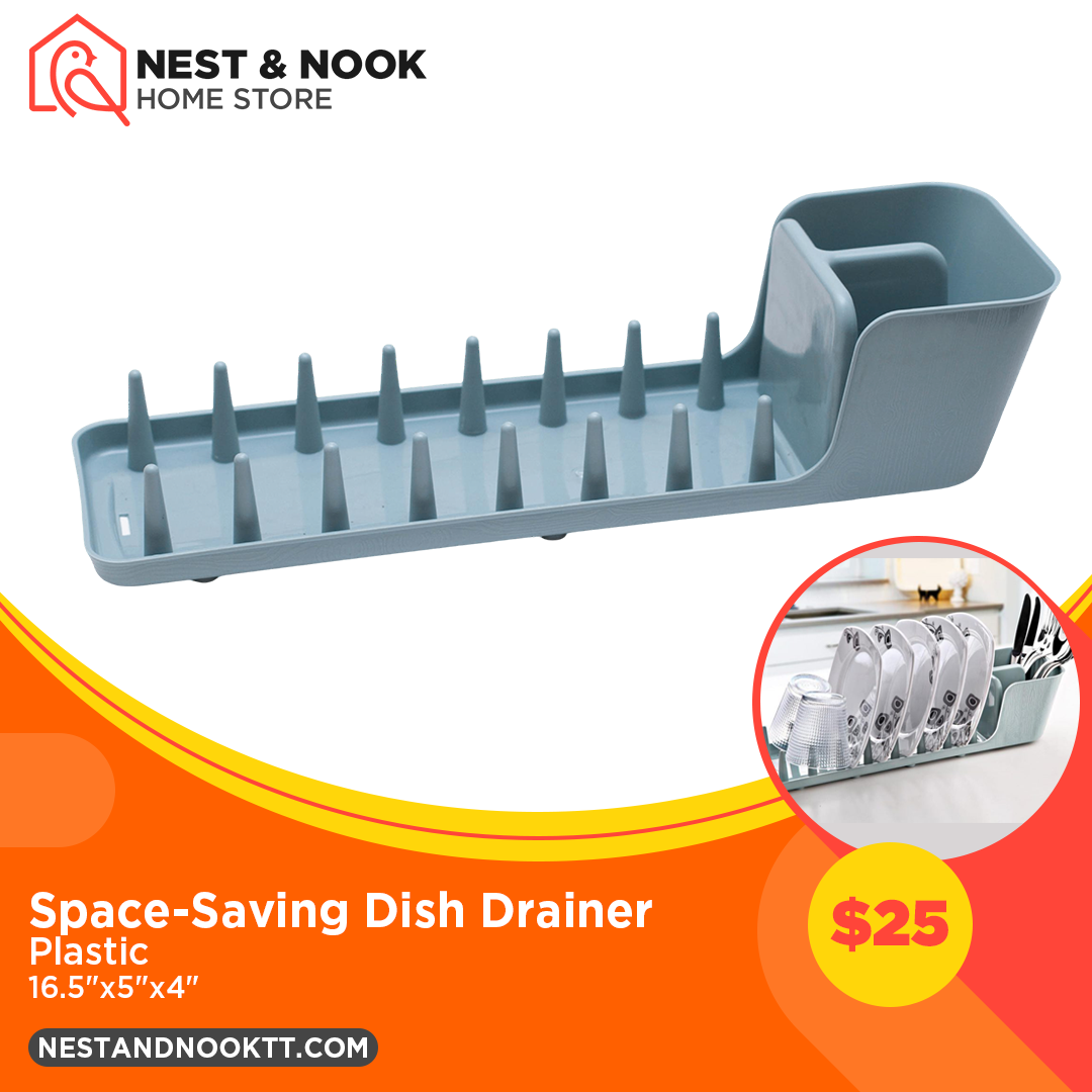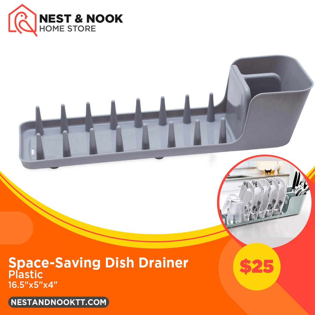 Introducing the Space-Saving Dish Drainer! Made of durable plastic, this compact dish drainer is designed to save space while also efficiently drying your dishes. Say goodbye to cluttered countertops and hello to a more organized kitchen. Simplify your life with this must-have kitchen item!